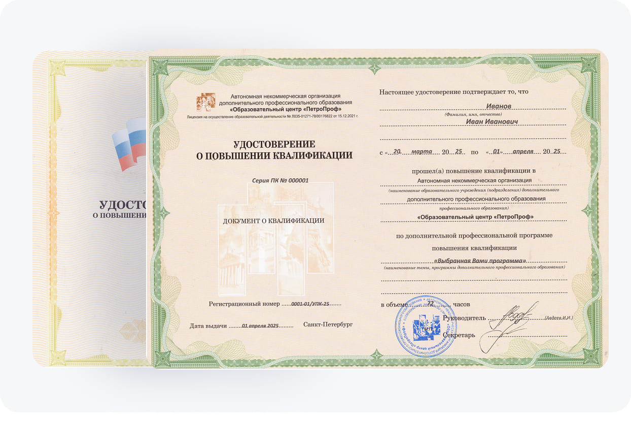 По завершении программы слушатели получают удостоверение о повышении квалификации (УПК). Это документ об образовании гос.образца, подтверждающий прохождение курса повышения квалификации и наличие необходимых компетенций для дальнейшей проф.деятельности. Учебный центр «ПетроПроф» имеет лицензию на образовательную деятельность.